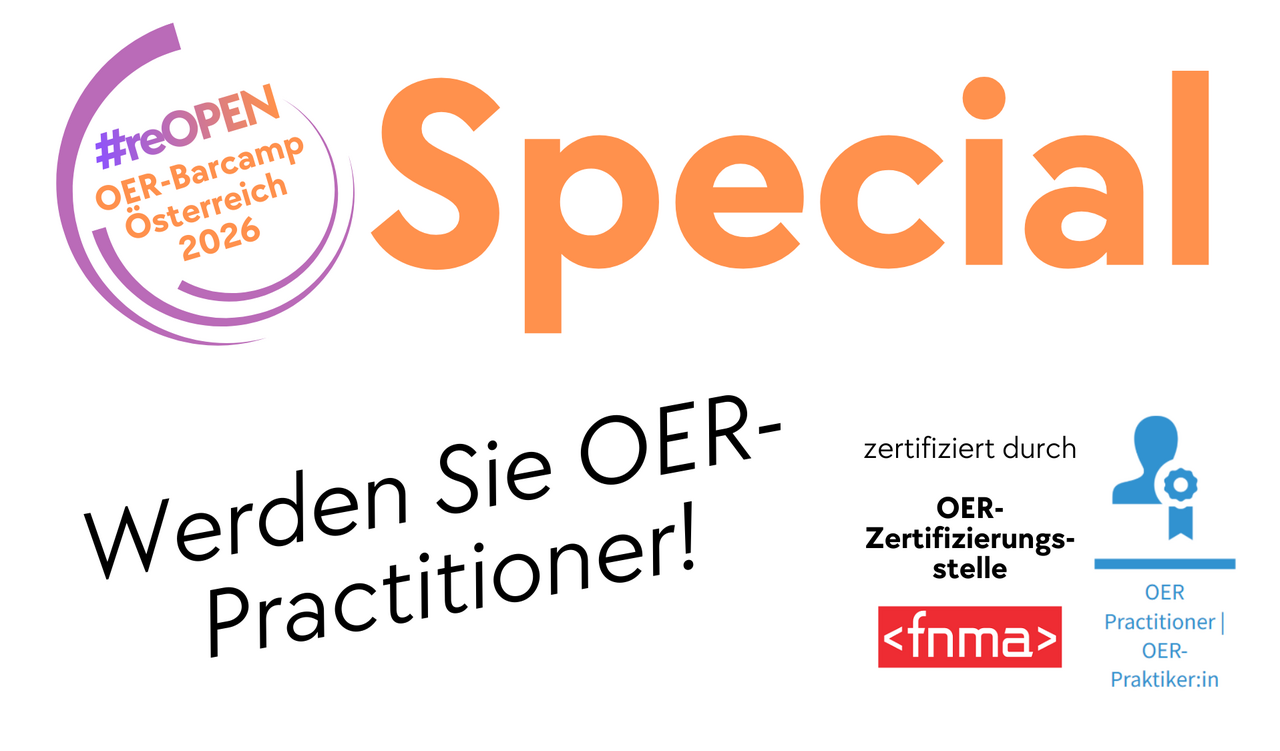 Das OER-Practitioner Special bietet im Rahmen des OER-Barcamps Österreich 2026 eine niederschwellige Möglichkeit, die OER-Practitioner-Ausbildung zu beginnen und die offizielle OER-Zertifizierung der FNMA zu erlangen – insbesondere für Personen, die an ihrer Hochschule aktuell keinen Zugang zu diesem Angebot haben.